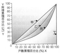 15 社會財富分配不均所導致的經濟不平等,是最常被注意到的社會階層化現象。羅倫斯曲線(Lorenz Curve)以 「最貧窮的人口計算起一直到最富有人口」的人口百分比對應各個人口百分比的收入百分比的點組成的曲線,來判斷經濟分配的狀況。下面有甲乙丙丁四個國家的曲線,請指出那一個國家的經濟不平等現象比較嚴重? (A)甲 (B)乙 (C)丙 (D)丁