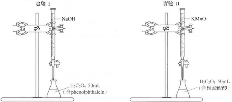 6. 稱取9.0克H₂C₂O₄(s)(分子量90)溶於蒸餾水配成100mL溶液,然後分成兩等份(各50mL),各置入錐形瓶中,分別進行下面兩組滴定實驗:(實驗裝置如圖所示)