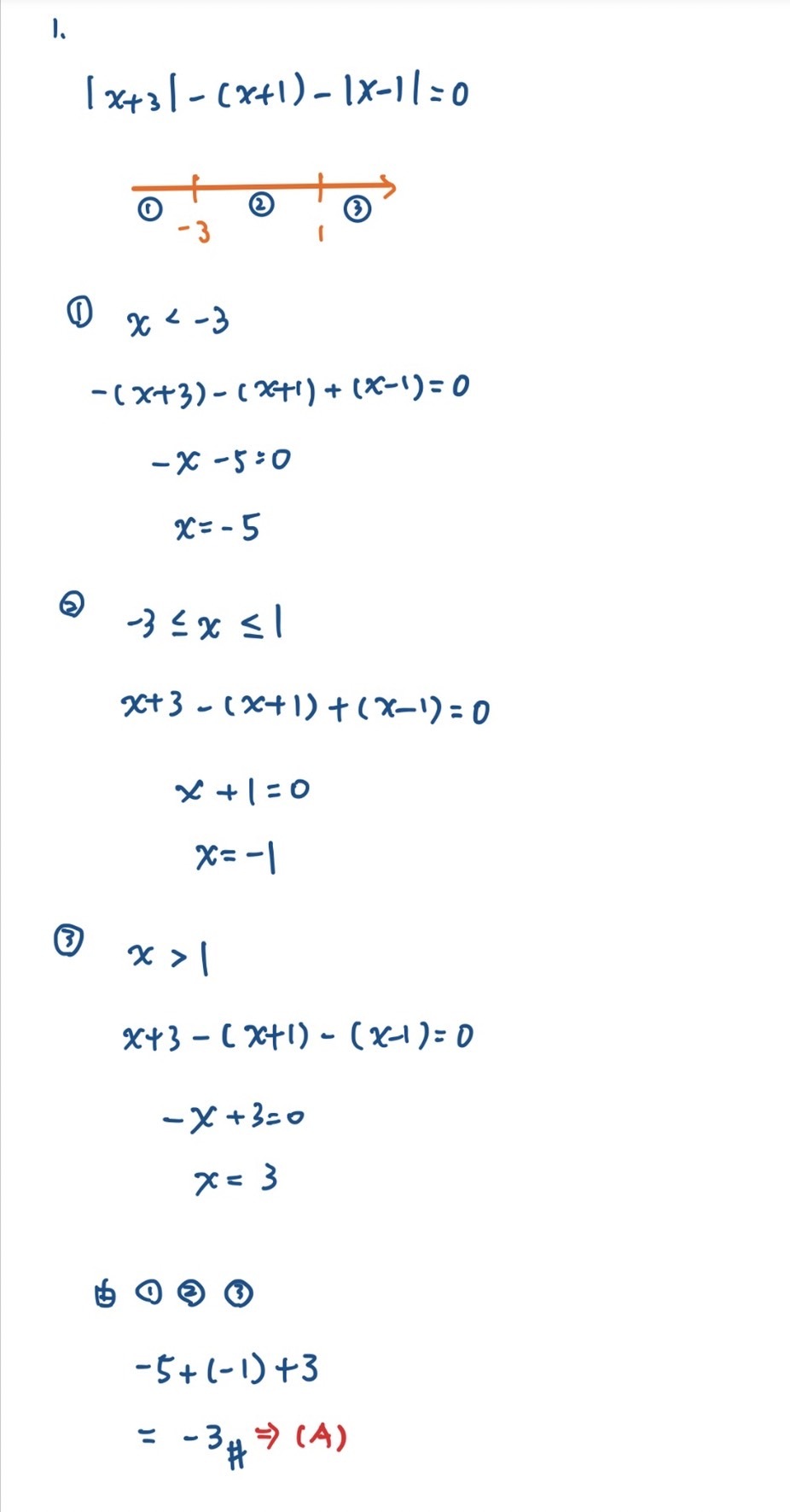 1. 求方程式|x+3|-(x+1)-|x-1|=0,所有解的和為多少?