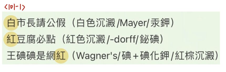 梅氏試劑:HgCl2(汞氯);范氏試劑:HgI2(汞碘);Wagner's試劑:I2(碘),全部都有包含KI(鉀碘)