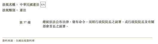 憲法第三十七條,總統依法公布法律,發布命令,須經行政院院長之副署,或行政院院長及有關部會首長之副署。