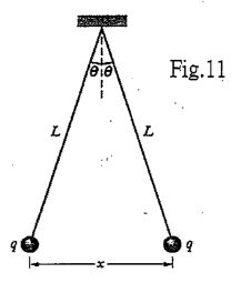 11. In Fig. 11, two tiny conducting balls of identical mass m and identical charge q hang from nonconducting threads of length L. Assume that θ is small, then the equilibrium separation x is approximately