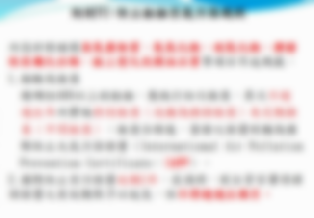 8. STCW 2010修正案 A-III/1 規定,輪機員最低適任標準規範,在控制船舶操作及船上人員管 理(操作級)之防止海上環境污染項目,下列何項沒有包括在內? (A) 防止污染程式及所有相關設備 (B) 採取保護措施防止海洋環境之重要性 (C) 防止船舶污染環境之研究發展 (D) 防止海上環境污染應採取之預防措施之知識