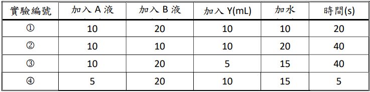 13. 濃度均為0.1 M的A、B兩種水溶液,分別取不同量的A液與B液混合進行反應如下:A+B →(催化劑Y)→ C+D。其中Y是催化劑,A為有顏色物質,B、C、D無色。測量A顏色完全褪去所需的時間後,所得實驗記錄如下表: