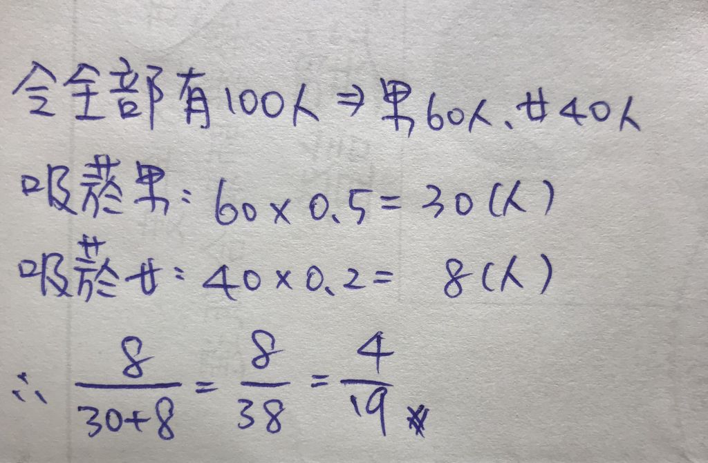 14. 某城市人口中有60%為男性,且男性中的50%及女性中的20%為吸菸者,則任選一吸菸者,其為女性的機率為?