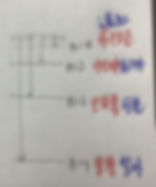 15. 氫原子的可見光譜中,明亮的紅色譜線最可能是由於電子在下列哪一軌域躍遷?