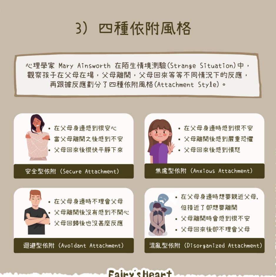 (A) 安全型依附-例: 媽媽在時,主動探索環境;媽媽離開時會不安,再度回來時會開心迎接。