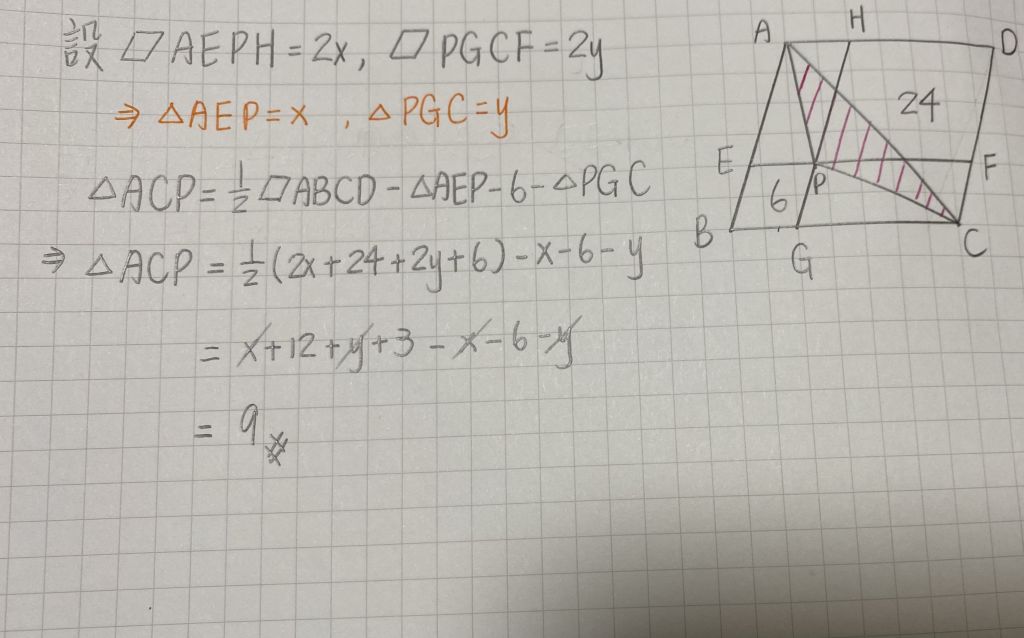 , 交四邊形於 E、F、G、H 四點,若四邊形 BEPG 面積=6,四邊形 PFDH 面積=24,則△ACP 面積=?