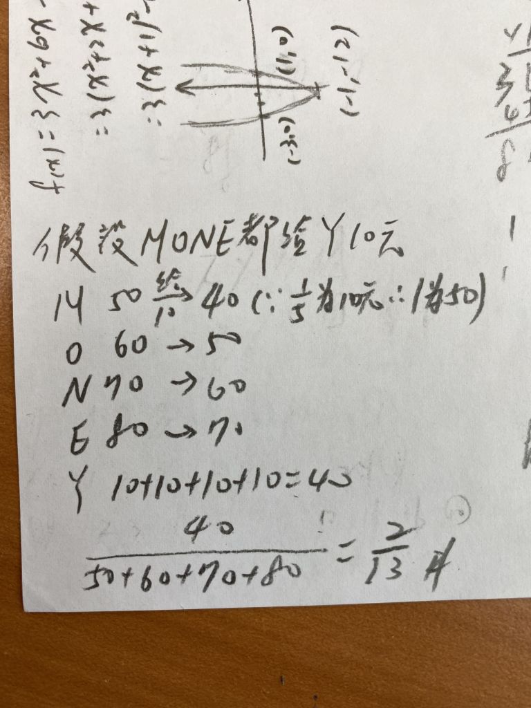 26、M、O、N、E、Y 等 5 人是一家人,Y 身上沒錢,而其它 4 人有錢。M、O、N、E 依序把自己身上的錢之
