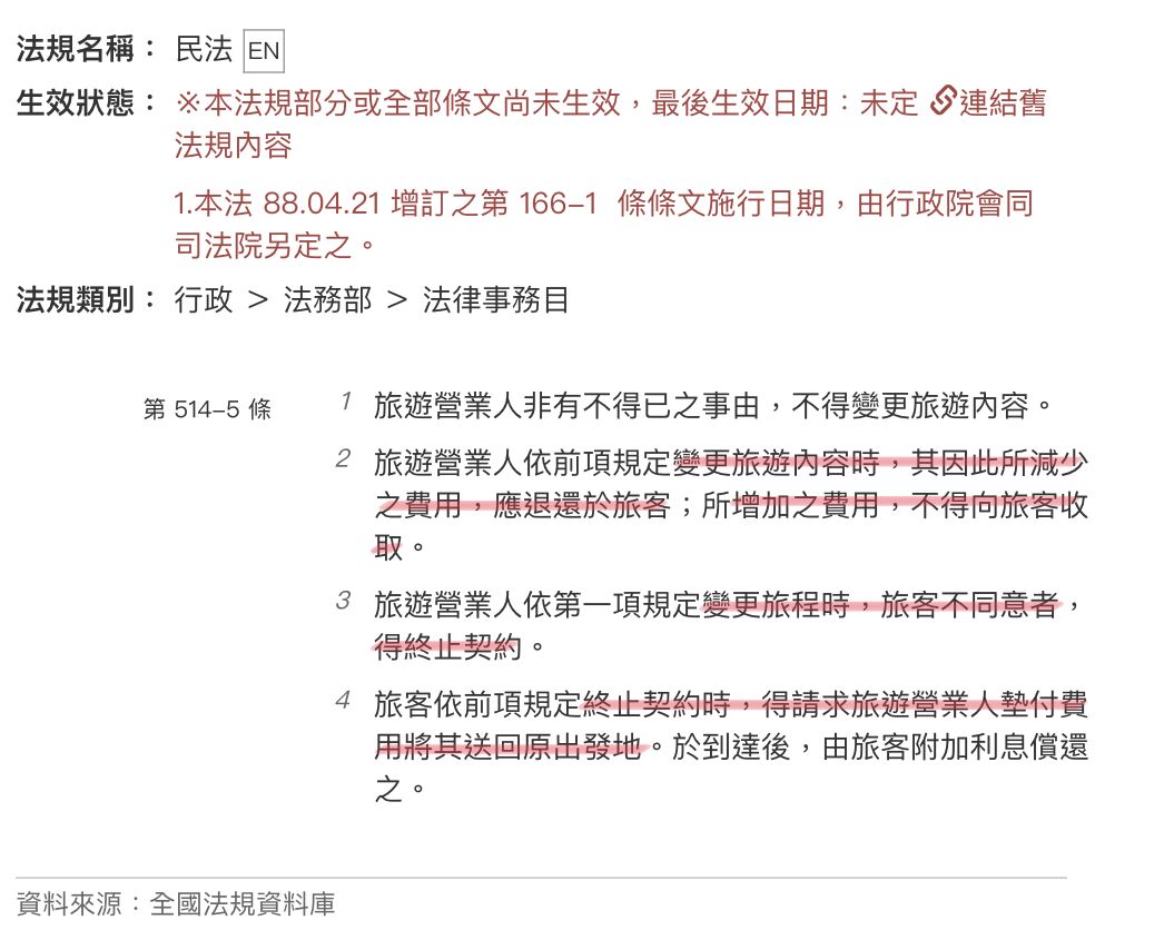 第五一四條之五 | 旅遊營業人非有不得已之事由,不得變更旅遊內容。 旅遊營業人依前項規定變更旅遊內容時,其因此所減少之費用,應退還於旅客;所增加之費用,不得向旅客收取。 |