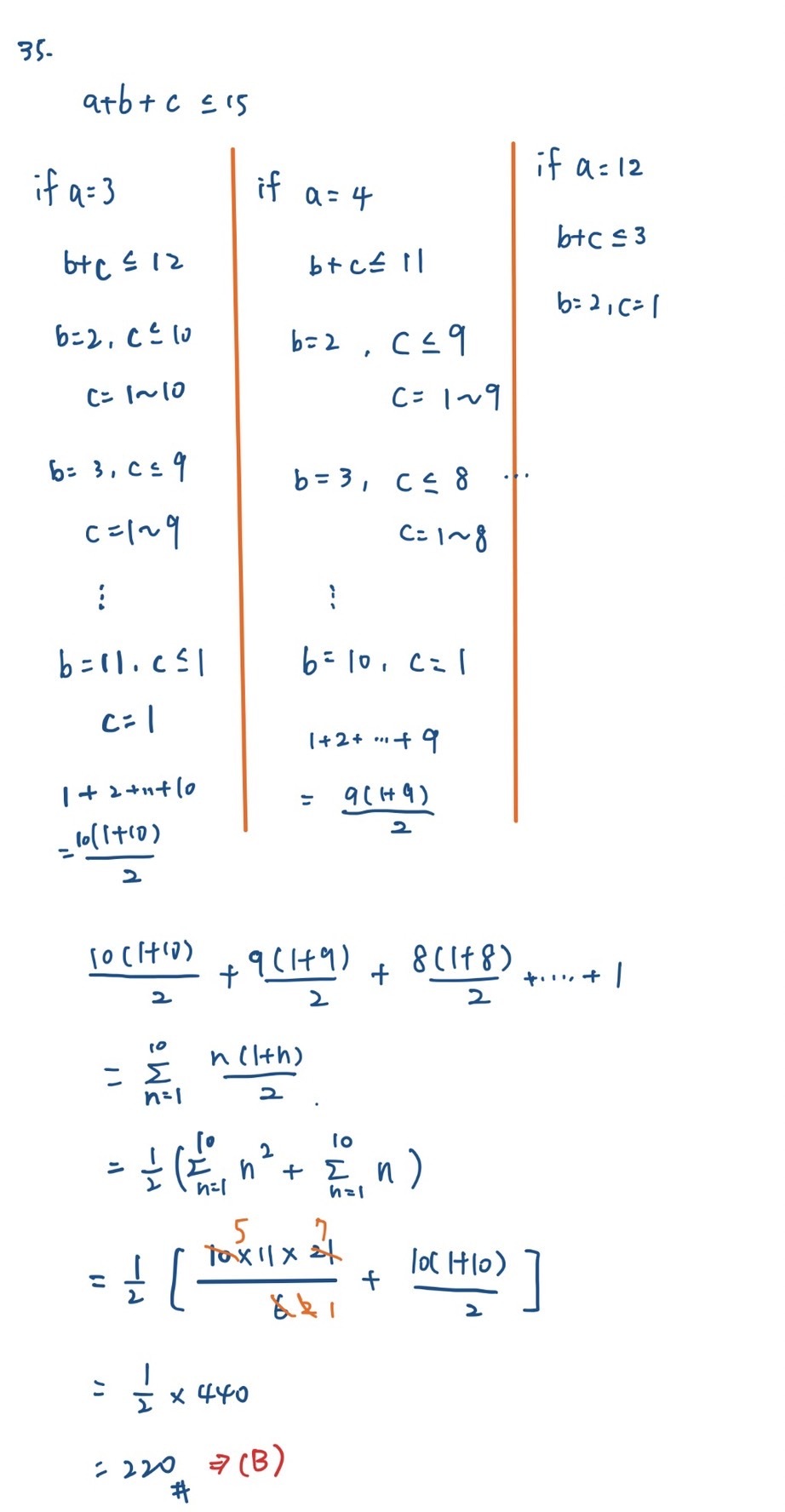 35. 設a ≥ 3 , b ≥ 2 , c ≥ 1,求a+b+c ≤15 的整數解(a, b, c)共有多少組?