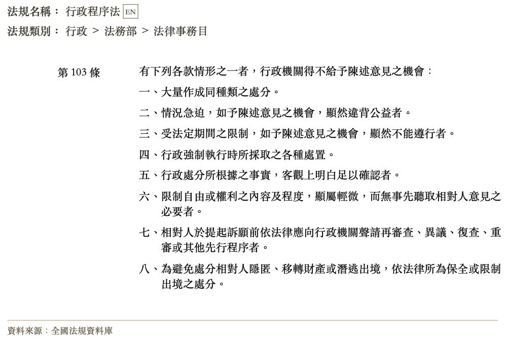 有下列各款情形之一者,行政機關得不給予陳述意見之機會︰