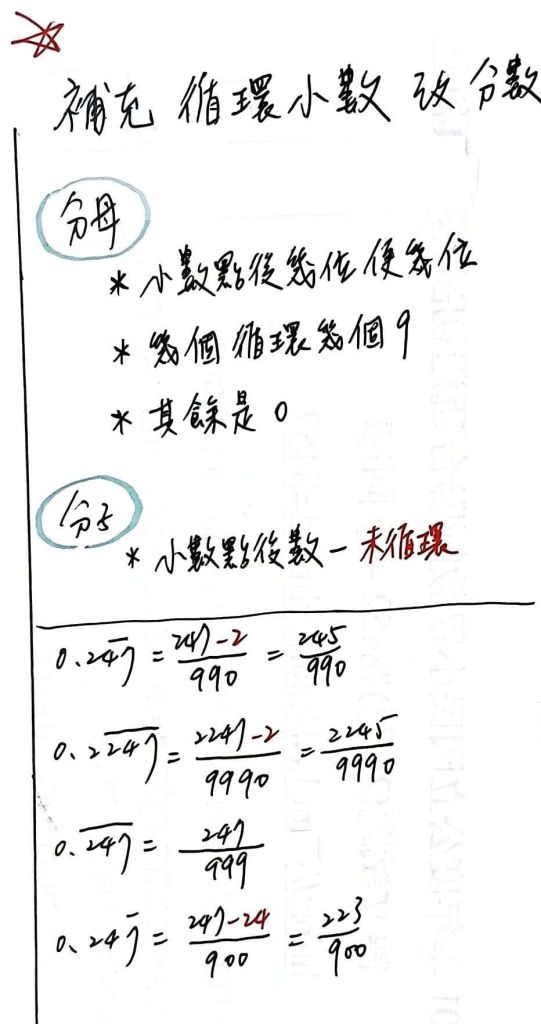 分母:循環小數寫於前,以9代表;非循環小數則寫於後,以0代表。