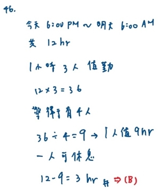 46. 假設有一警衛室每小時要有 3 個人值勤,今有警衛 4 人,他們從今天下午 6 時到明天早上 6 時輪流值勤,請問這段時間每個警衛平均休息幾小時(即不 用值勤時間)?