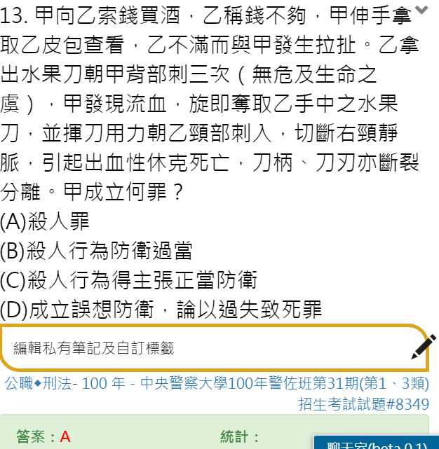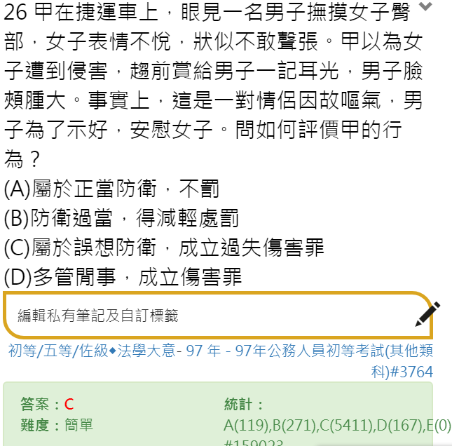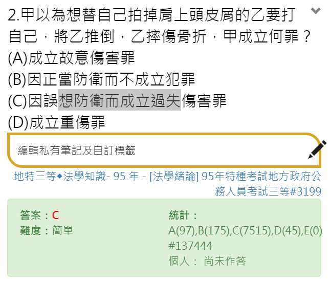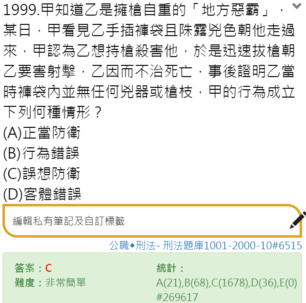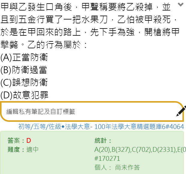 本題情況不具備「現在」「不法」「(人為)之侵害」等「防衛情狀」,但甲確實是出於「防衛意思」才做出防衛行為,僅成立誤以為有防衛情狀之「誤想防衛」。