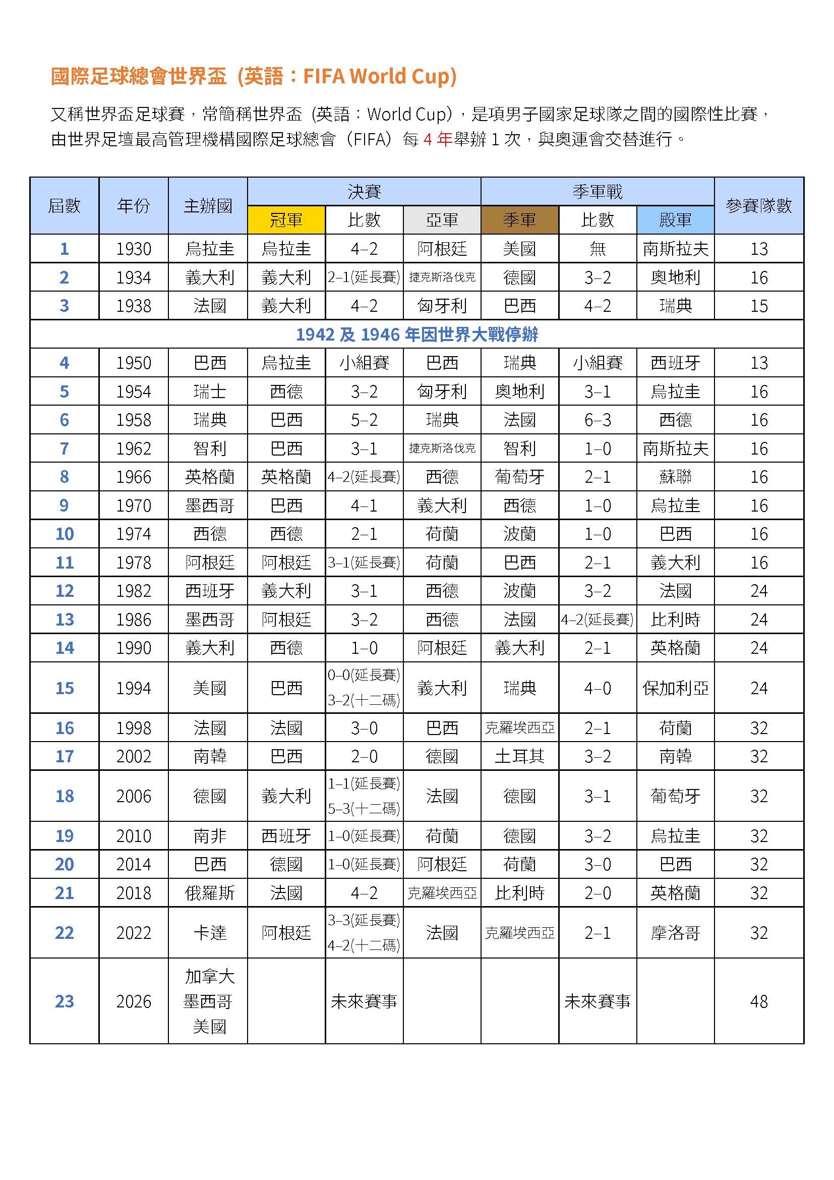 界盃足球賽的敘述,下列何者有誤?