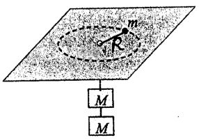 5. A particle of mass m travels in a horizontal circle of radius R on a frictionless table. The centripetal force is provided by a string passing through a hole in the table attached to two blocks of equal mass M, as shown in the figure. If one hanging block is removed, what will the radius of the particle motion become?