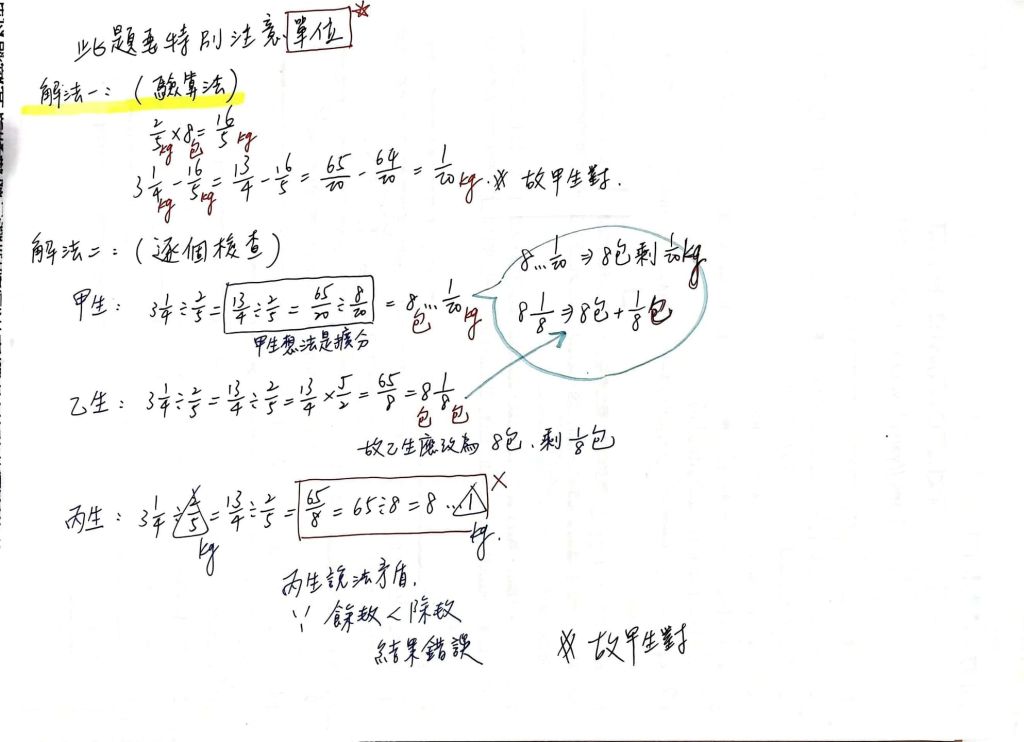 公斤裝一包,可以裝幾包?剩幾公斤?」的解法。 請問誰的解法是正確的?