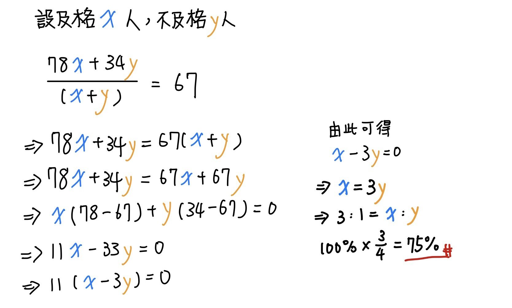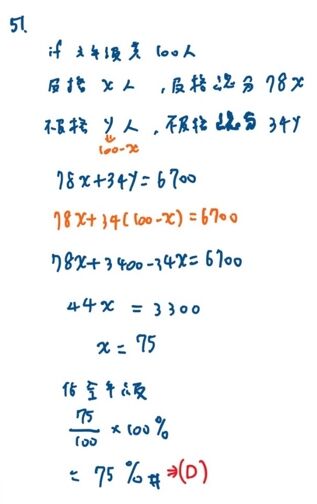 51. 某國小六年級學生在數學月考中,及格學生之平均分數是 78 分,而不及格 學生之平均分數是 34 分。已知全年級學生的總平均分數是 67 分,請問及 格的人數佔全年級人數的百分比是多少?