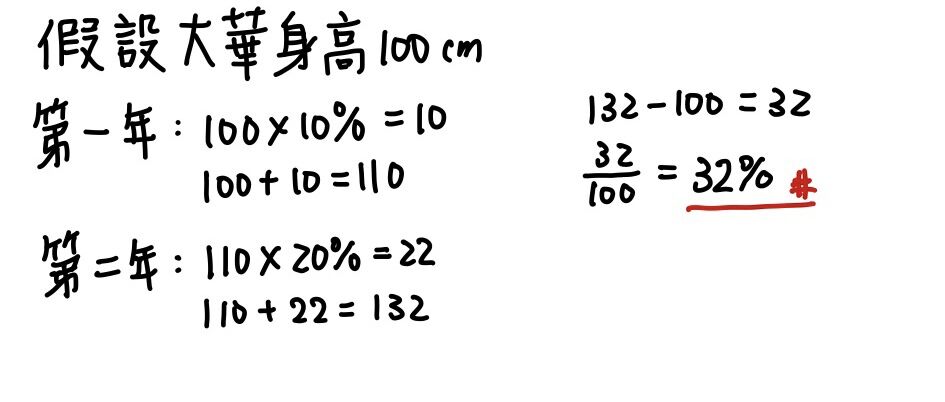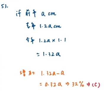 53. 大華今年的身高比去年增加了 10%,而去年又比前年增加了 20%,請問在 過去兩年內,大華的身高增加了多少%?