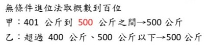 無條件進位法取概數到百位是 500 公斤,表示實際重量在 400 公斤到 499 公斤之間的數字都會進位到 500 公斤。因此,乙的回答「超過 400 公斤、500 公斤以下」是正確的。