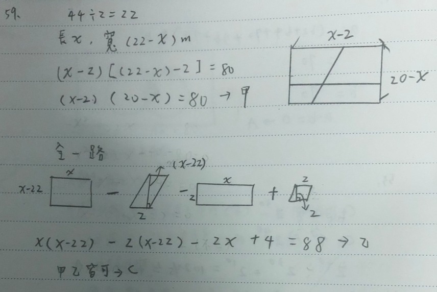 乙、(22 − x)x − 2x − 2(22 − x) + 4 = 80