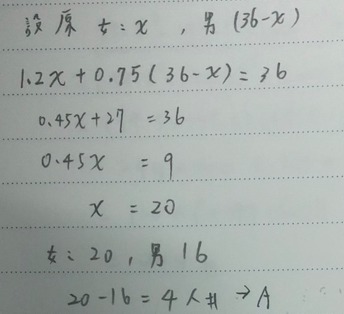 61. 某校羽球社團原有 36 人,但這學期的女同學增加 20%,男同學減少