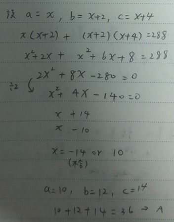 63. 若a、b、c為三個連續正偶數,且 ab + bc = 288,則a + b + c=?
