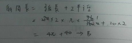 64. 在半徑為 20 公分的圓中,圓心角為 36˚的扇形周長為多少公分?
