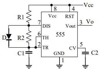 9.如圖1-5所示電路,由555計時器組成的無穩態多諧振盪器電路,其中R1、R2各為1kΩ,D為理想二極體,則下列敘述何者正確?