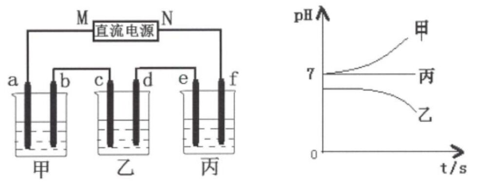 11. 將由Na⁺、Ba²⁺、Cu²⁺、SO4²⁻、(濃)Cl⁻,其中任選2種離子所組合形成的三種強電解質溶液,分別裝入下圖裝置中的甲、乙、丙三個燒杯並以惰性電極進行電解。通電一段時間後,測得重量增加的只有乙杯中的c電極。若經測定在常溫下,各燒杯中溶液pH與電解時間的關係如右下圖。忽略氣體產物溶於水的影響,試回答下列問題:(Na=23、Ba=137、Cu=63.5、S=32、Cl=35.5)