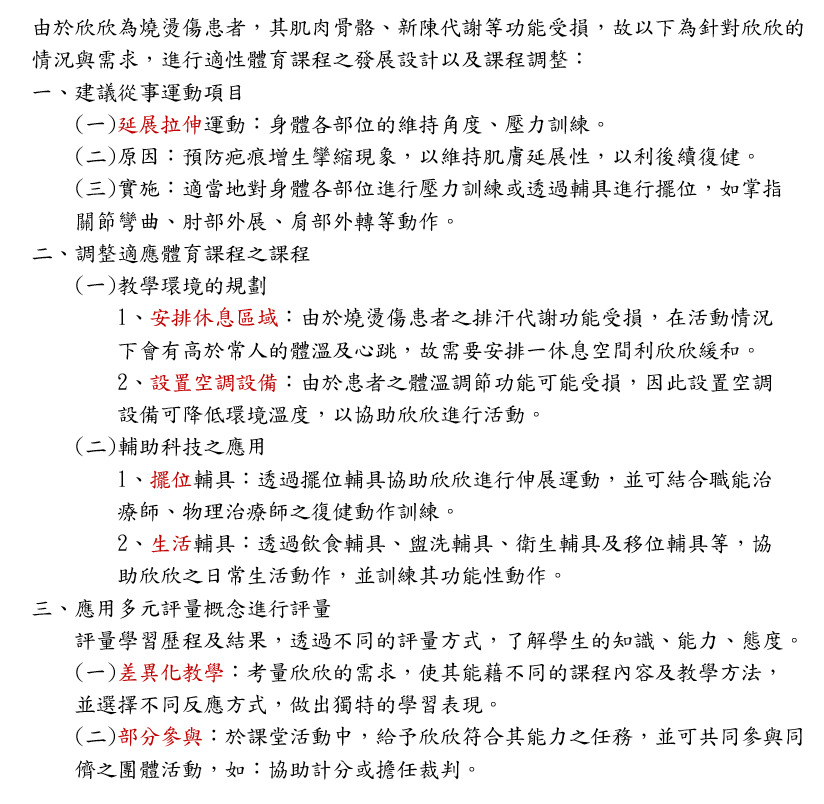 (3)當欣欣的體育老師與您討論她的個別化教育計畫時,尤其是適應體育課程的發展 與設計時,在選定運動項目後,你會建議她如何進行『教學環境的規劃』與『輔 助性科技』的選擇?