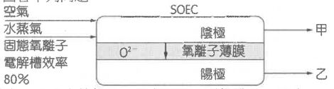 5. 丹麥於2021年啟動了氫氣工業生產的綠色程序,使用固態氧離子電解槽(SOEC),過程中不需要高成本的空氣分離,附圖為其裝置圖,當適當地將空氣和水蒸氣通入陰極,兩者均進行電解,氧氣生成O²⁻,水蒸氣產生H₂和O²⁻。氧離子薄膜只允許離子(O²⁻)通過,並在陽極反應後,由已知SOEC電解水的效率可達80%,在通入莫耳比為1:3的空氣和水蒸氣後,經電解生成甲和乙兩部分的水蒸氣,而甲通過過濾水裝置後,直接導入哈伯法程序,即可製造氨氣。