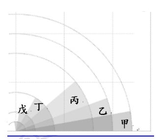 5.如下圖。有 5 個同心圓的扇形,其半徑分別為 2, 4, 8, 10, 12 單位長;圓心角分別為 100 度、80 度、60 度、40 度和 20 度。請問:__________扇形區域的面積最大?