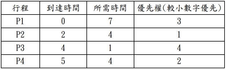 5.CPU 排程中,各行程到達時間、所需時時間、優先權如下表,請使用以下排程演