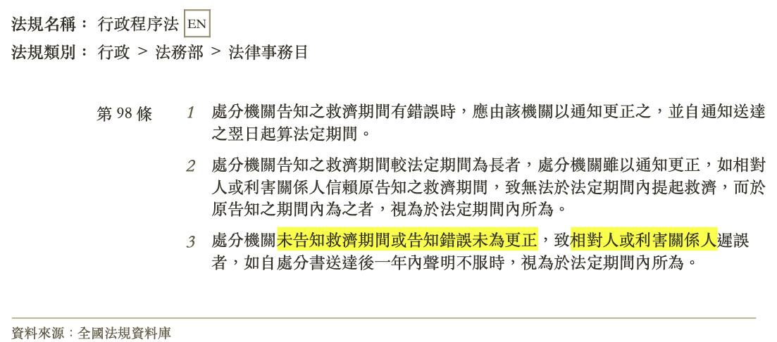 13 依實務見解,行政程序法第 98 條第 3 項規定,自處分書送達後 1 年內聲明不服時,視為於法定