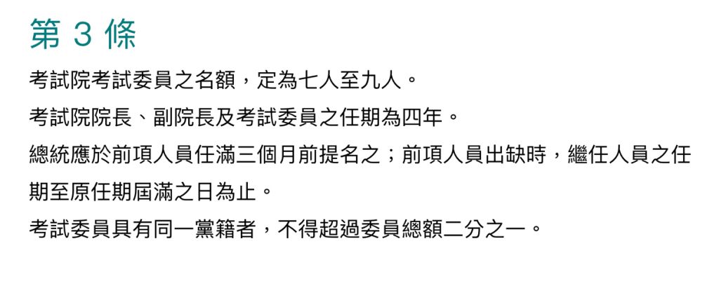 考試院組織法第3條 出缺時,繼任人員之任期至原任期屆滿之日為止。