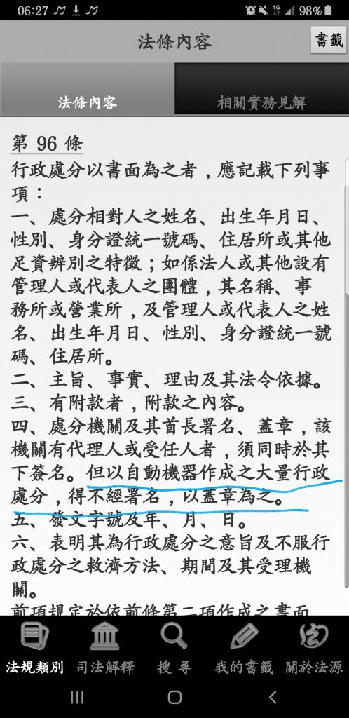 (B)以自動機器作成之大量行政處分,得不經處分機關及其首長署名,以蓋章為之