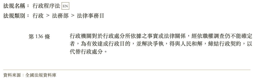 行政機關對於行政處分所依據之事實或法律關係,經依職權調查仍不能確定者,為有效達成行政目的,並解決爭執,得與人民和解,締結行政契約,以代替行政處分。