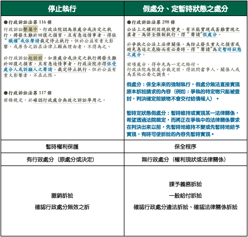 按「原行政處分之合法性顯有疑義者,或原行政處分之執行將發生難以回復之損害,且有急迫情事,並非為維護重大公共利益所必要者,受理訴願機關或原行政處分機關得依職權或依申請,就原行政處分之全部或一部,停止執行。」「前項情形,行政法院亦得依聲請,停止執行。」,為訴願法第93條第2項及第3項所分別明定。