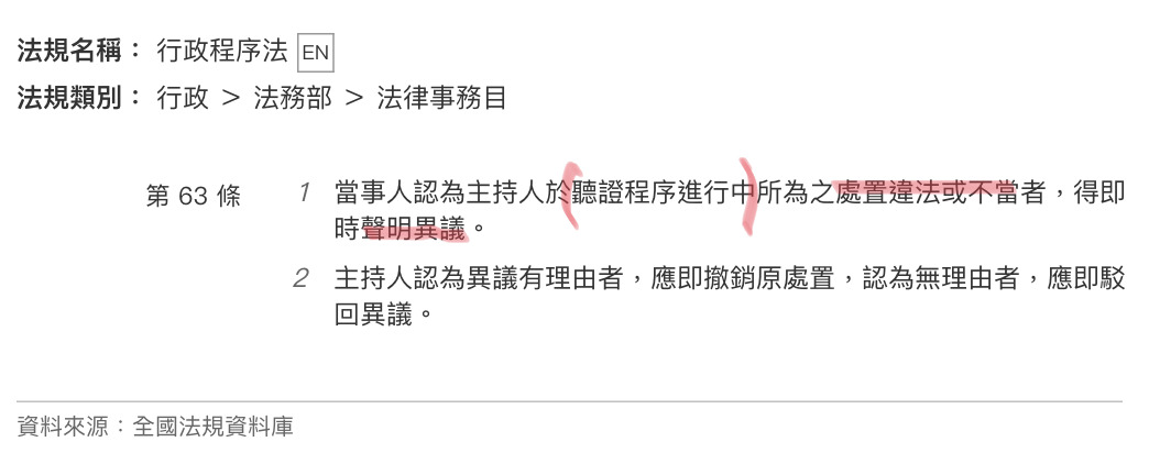 (C)為維繫聽證程序順暢,故聽證程序之當事人不得對聽證主持人之處置聲明異議