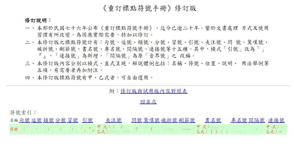 一、 本部於民國七十六年公布《重訂標點符號手冊》,迄今已逾二十年,鑒於文書處理 方式及使用習慣有所改變,為因應實際需要,特加以修訂。
