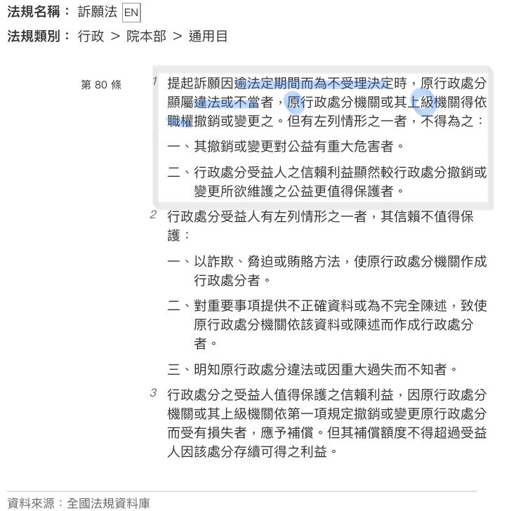 提起訴願因逾法定期間而為不受理決定(A)時,原行政處分顯屬違法或不當者