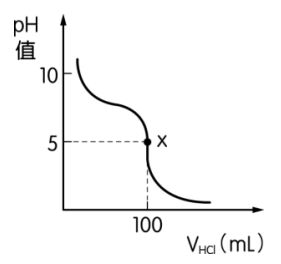 11.在25℃時,某一元鹼BOH(aq) 100 mL,以0.2 M HCl(aq)滴定得右圖,圖上x點表示當量點,求當加入HCl(aq) 若干mL時,溶液恰呈中性?(答案請寫至小數點下兩位)