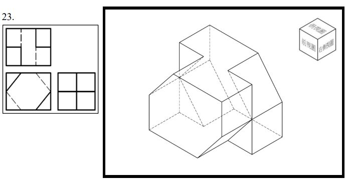 二、21 至 25 題請依左邊之正投影視圖繪製等角立體圖(隱藏線需繪出),並請 依右上角圖示方向繪製。(每題 4 分,共 20 分) (請用鉛筆、尺、橡皮擦作答,否則不記分)