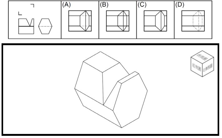 三、26 至 30 題請依圖示之正投影視圖選擇所缺之正確視圖,並於下方空格徒 手畫等角立體圖(隱藏線 不需 繪出),並請依右上角圖示方向繪製。 (每題選擇部分 2 分,徒手畫部分 4 分,共 30 分) (請用鉛筆、尺、橡皮擦作答,否則不記分)