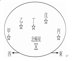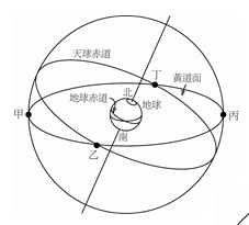 【已刪除】41. 已知民國96年的秋分是國曆9月23日,請問期中考 這兩天(10月11日和12日), 太陽在天球上(如下圖)的位置 最接近圖上甲乙丙丁的哪一點?__________________ 。