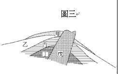 【已刪除】13. 上圖三是一處岩層的地質剖面圖,其中甲、乙、丙、丁分別代表四種不同沉積岩地層,戊代表火成岩脈。依照被截切的地層比截切者較早形成的原理,下列何者最晚形成?