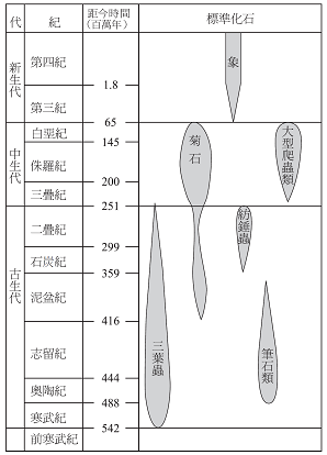 【已刪除】17. 下表為地質年代與各類生物化石存在的時間和數量(表中以寬度表示,越寬表示數量越多)的關係,下列相關敘述,何者正確? (A)三葉蟲曾悠游於侏羅紀的海洋中 (B)臺灣西部山區的第三紀海相地層中可發現菊石化石 (C)二疊紀和三疊紀之間的生物滅絕事件,只促成大型爬蟲類動物的發展 (D)菊石類生物從古生代開始發展,在古生代晚期曾減少,直到中生代末期才滅絕 圖回答問題。