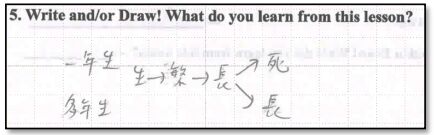 16. 陳老師雙語自然課以蔬菜的生命週期為主題,課程結束後,學習單最後一題的題目及甲生的填答情形如下圖所示: 請問以下有關甲生的回答何者正確? (A)主要展現科學內容的學習 (B)甲生沒有學到語言相關的目標 (C)甲生對蔬菜的生命週期理解正確 (D)以雙語進行教學導致甲生學習狀況不佳